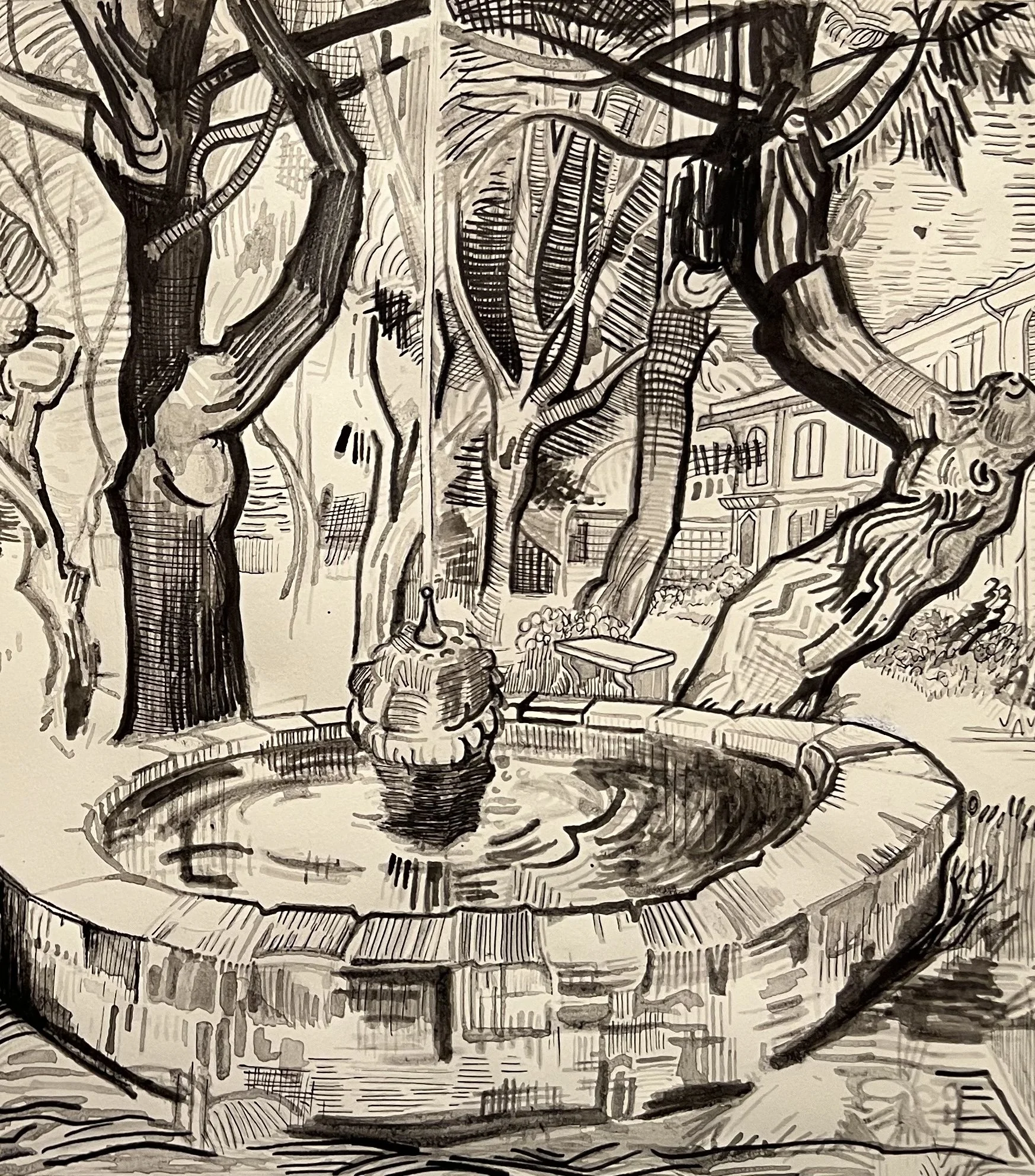 Replica painting of van Gogh’s Fountain in the Garden of the Asylum. Completed in pen and diluted ink on acid free paper.